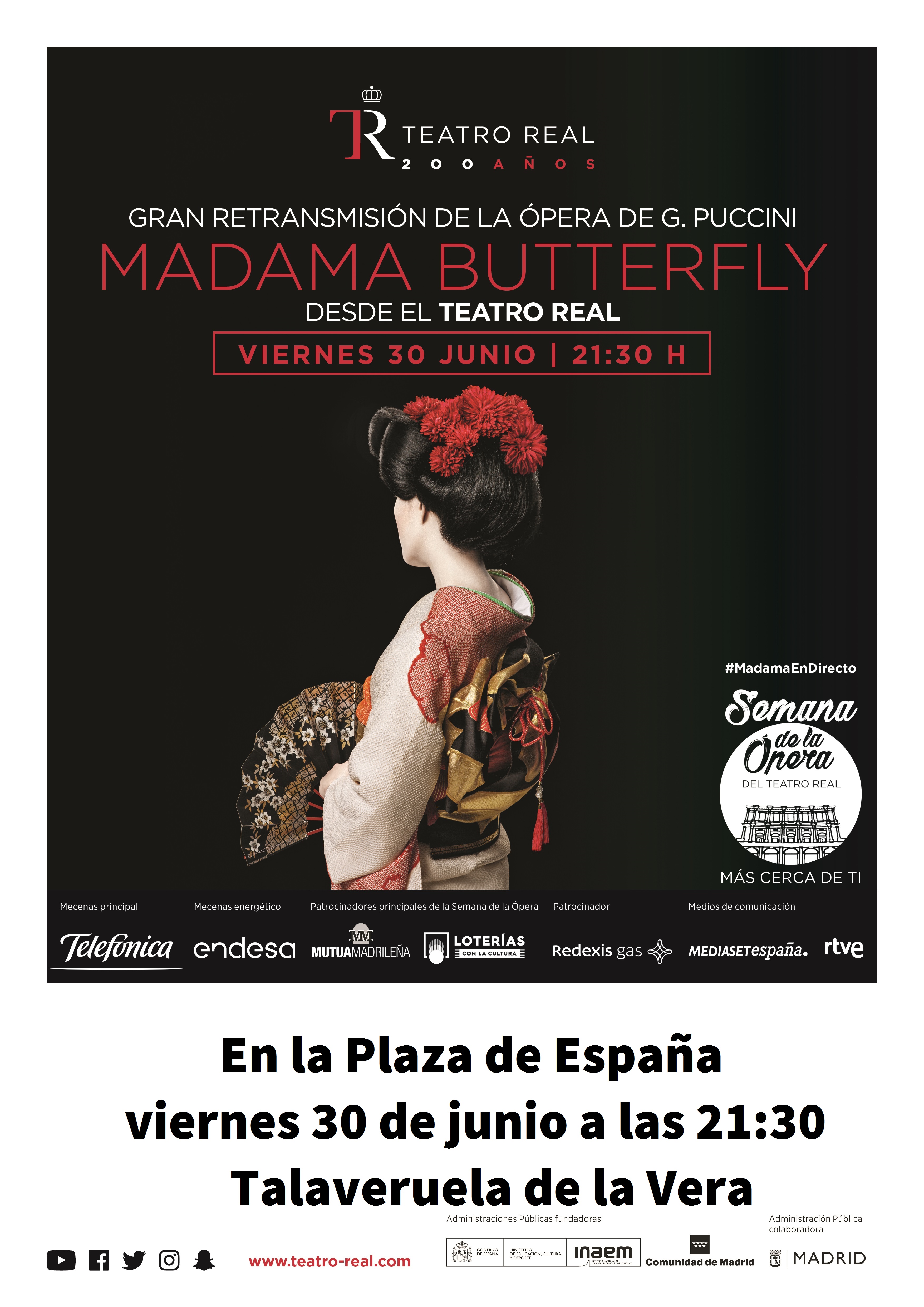 El 30 de Junio del 2017,a las 21:30, tendremos ÓPERA en la plaza de Talaveruela, MADAME BUTTERFLY e G. Puccini, retransmitida directamente desde el Teatro Real. en la semana de la ópera.