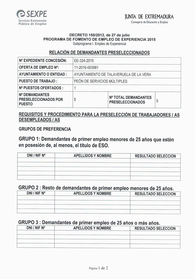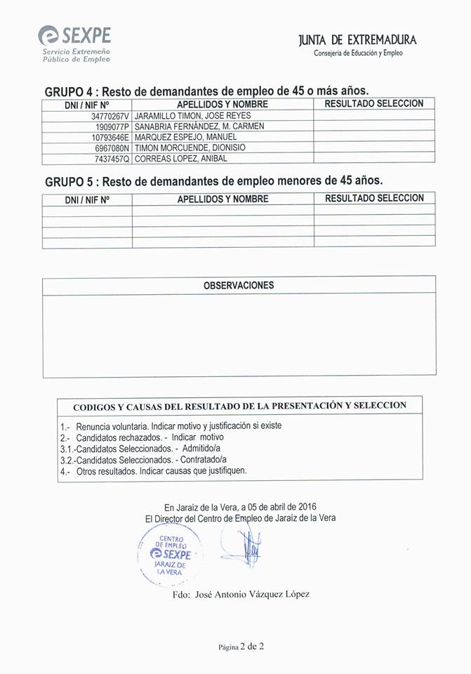 Peon de usos multiples 6 meses . A continuacion lista de personas candidatas. Se llamará para cubrir el puesto por el orden establecido en la lista.