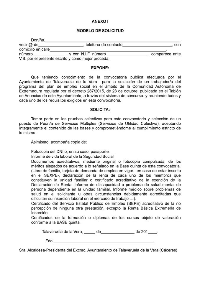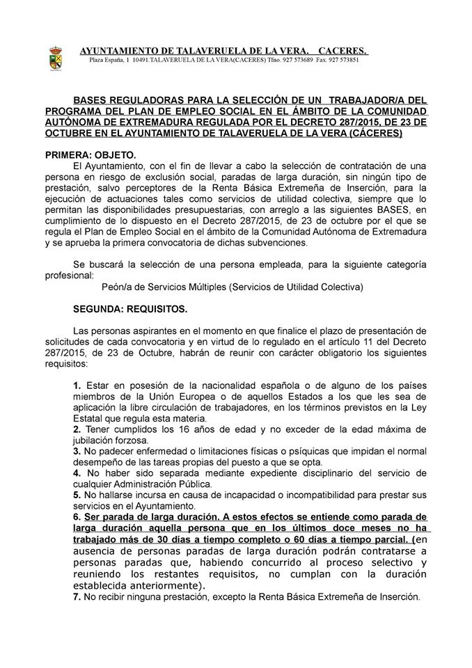 Publicamos las bases para la contratación por el Decreto de Empleo Social de la Junta de Extremadura de un/a peón/a de servicios múltiples durante seis meses.