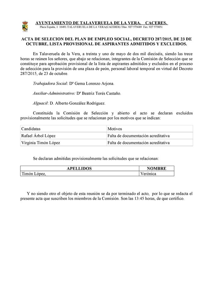 Se hace pública la lista provisional de admitidxs a la convocatoria de una plaza de peón/a de servicios múltiples mediante el Decreto de Empleo Social. Hay plazo solo hasta el 6 de Junio para aportar documentación antes de cerrar el proceso de selección.