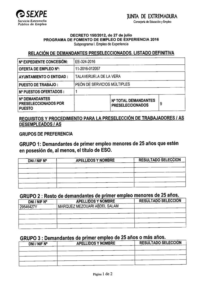 Un peon de usos multiples para 6 meses que tenga carnet de conducir tipo B. Tiempo de Trabajo 30 horas semanales durante 6 meses.